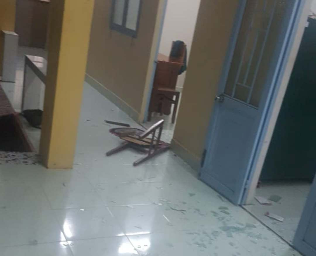 Lúc này, một dân quân thường trực nhắc nhở nhóm người trên thì có hai thanh niên dừng lại thách thức. Một lúc sau, khoảng 20 thanh niên xông vào tấn công trụ sở UBND xã và dùng kéo đâm 3 người bị thương.