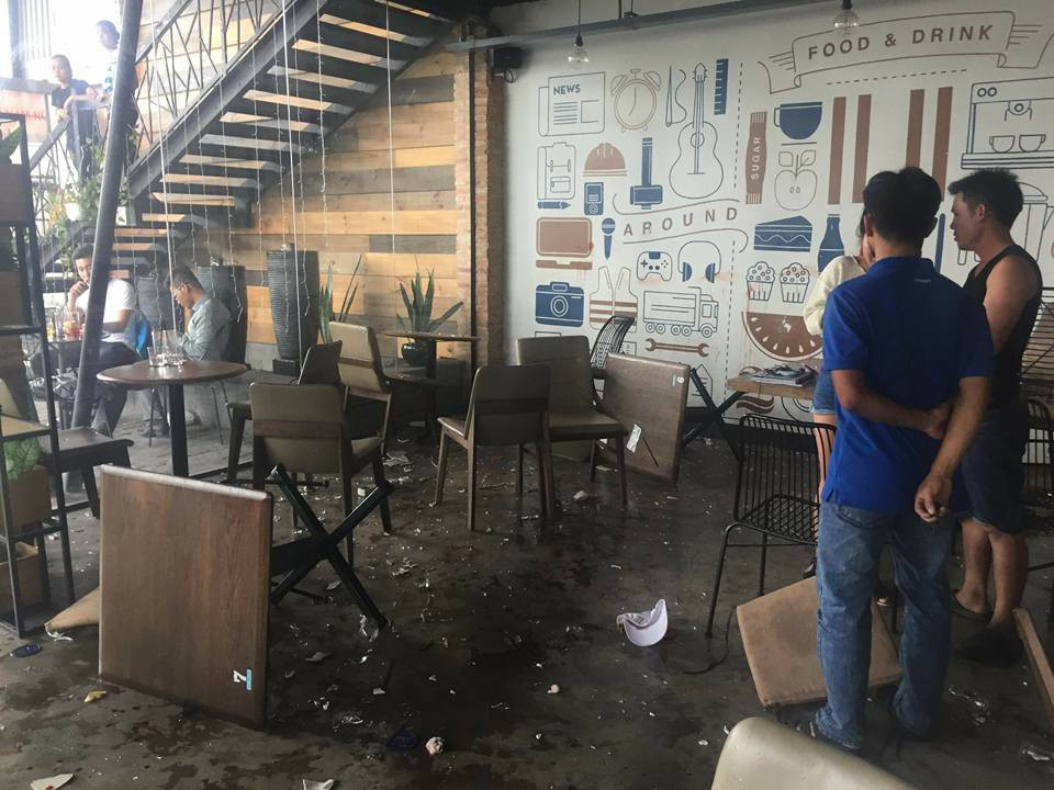 Đang ngồi nói chuyện, một số người trong nhóm xảy ra cự cãi rồi dùng bàn ghế, ly ném nhau khiến nhiều khách trong quán hoảng sợ, bỏ chạy tán loạn.