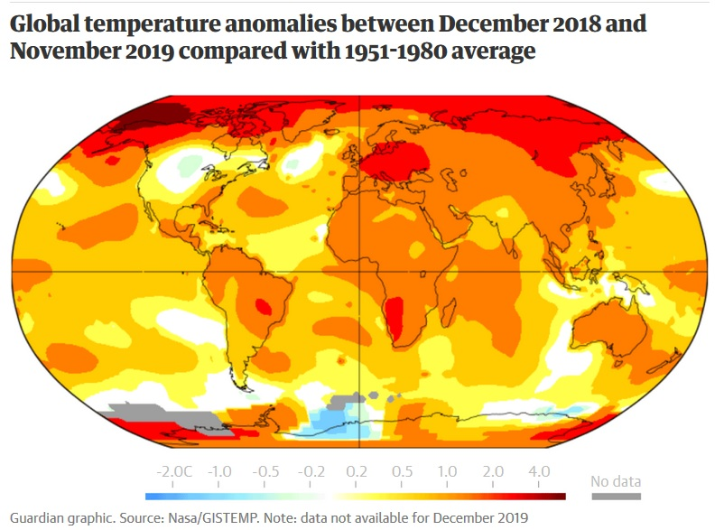 Bản đồ so sánh sự nóng lên toàn cầu từ tháng 12/2018 đến tháng 11/2019 với mức trung bình năm 1951-1980.(Ảnh: NASA)