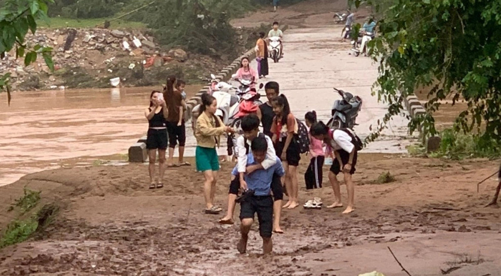 Các thầy, cô giáo cõng học sinh vượt qua đoạn bùn đất lún sâu để đến trường học ở Quảng Bình.