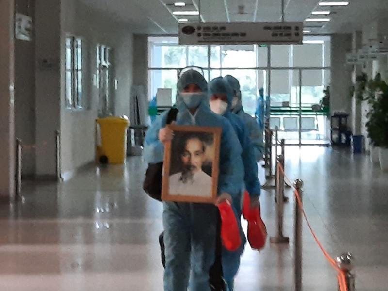 Bệnh nhân mắc COVID-19 trên tay mang tấm ảnh Bác Hồ khi về đến bệnh viện.