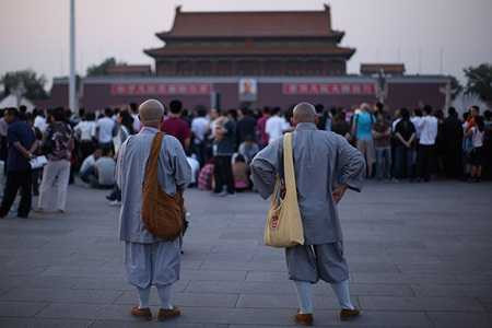 | Hai nhà sư Trung Quốc đang đứng đợi lễ hạ cờ tại Quảng trường Thiên An Môn, Bắc Kinh |
