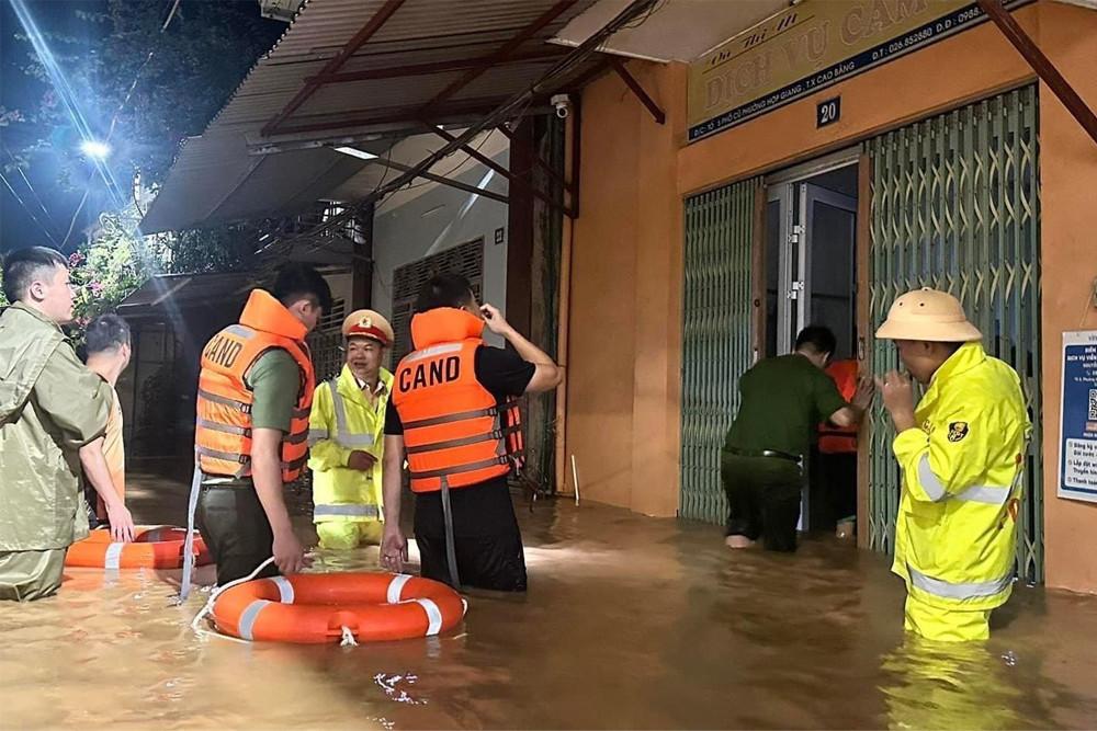 Công an TP Cao Bằng (tỉnh Cao Bằng giúp người dân sơ tán tài sản đến nơi an toàn trong đêm 8/9. (Ảnh: TTXVN)