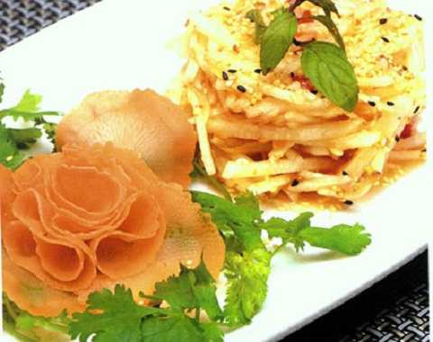 - Củ đậu, cà rốt thái chân hương, rau mùi, rau thơm thái khúc to. Mực nướng chín, xé nhỏ trộn với củ đậu và cà rốt, rau thơm bày ra đĩa.