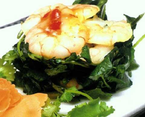 - Rau cải xoong ngắt nhỏ, cà rốt, hành tây thái chỉ. Tôm sơ chế sạch, bóc vỏ, tẩm ướp sốt ớt gà, tiêu, muối sau đó đem áp chảo.