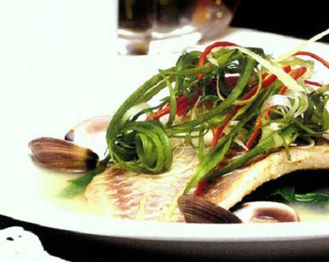- Cá tẩm ướp, muối, tiêu, bột hải sản, áp chảo qua, sau đó cho vào hấp nước ngao. Rau mồng tơi cho vào nước luộc ngao hấp.