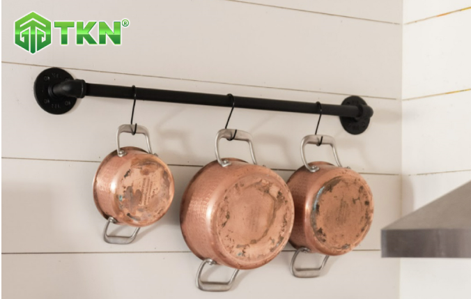 Giá treo nồi tận dụng tối đa không gian trống trên tường bếp.