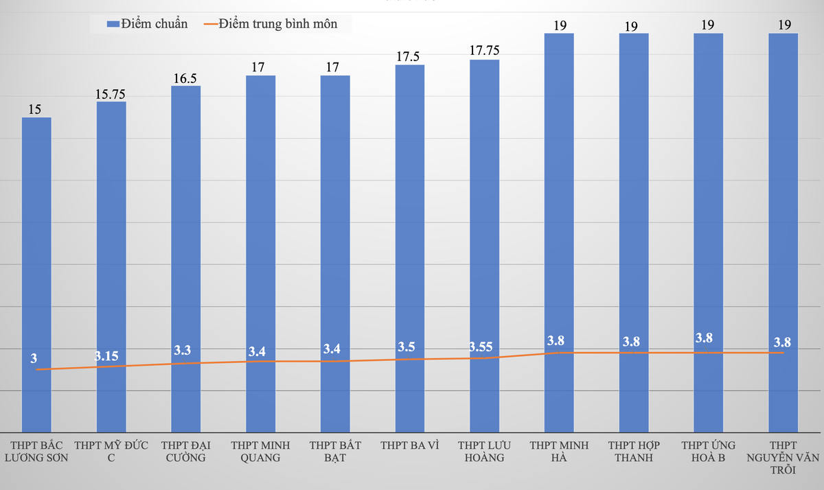 Bốn trường khác lấy điểm chuẩn ở ngưỡng 17, gồm Bất Bạt, Minh Quang, Ba Vì và Lưu Hoàng. Những trường còn lại của top 11 thấp nhất là Ứng Hòa B, Minh Hà, Hợp Thanh và Nguyễn Văn Trỗi, cùng lấy điểm chuẩn 19. Điểm trung bình môn của những trường này dao động 3,4 - 3,8.