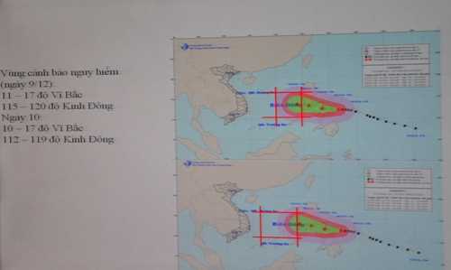 Trung tâm Khí tượng Thủy văn Trung ương cũng nêu các vùng cảnh báo nguy hiểm vào ngày 9/12 như sau: 11-17 độ Vĩ Bắc, 115-120 độ Kinh Đông. Ngày 10/12:10-17 độ Vĩ Bắc, 112-119 độ Kinh Đông.