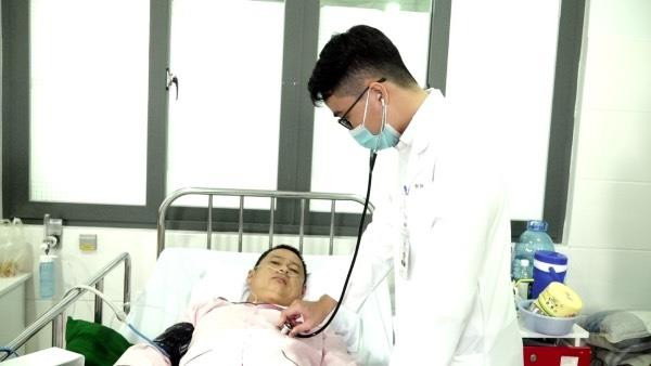 Bệnh nhân H. được bác sĩ thăm khám sau khi can thiệp mạch thành công.