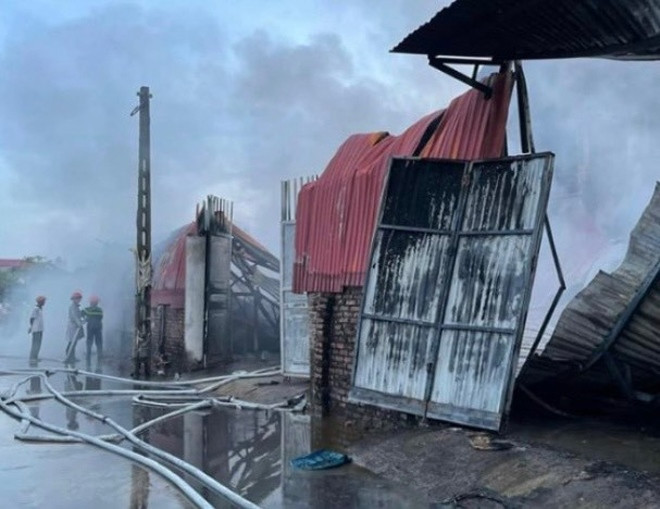 Khoảng 300m2 nhà xưởng bị cháy thiêu rụi, hư hỏng hoàn toàn.