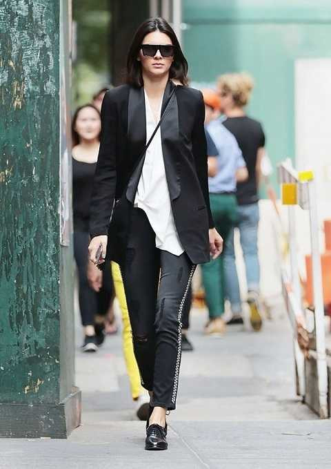Áo jacket, Blk Dnm; Áo trắng đắp vạt bất đối xứng, Victoria Beckham; Quần jeans đen, Etienne Marcel; Brogues đen, Manolo Blahnik; Túi xách, Saint Laurent.