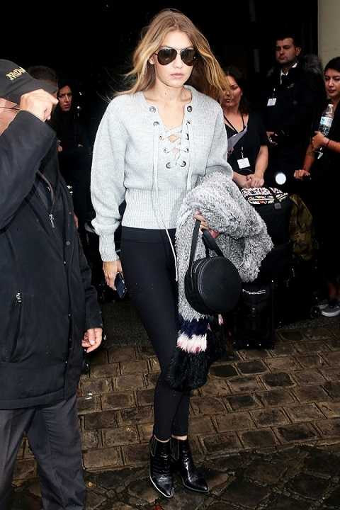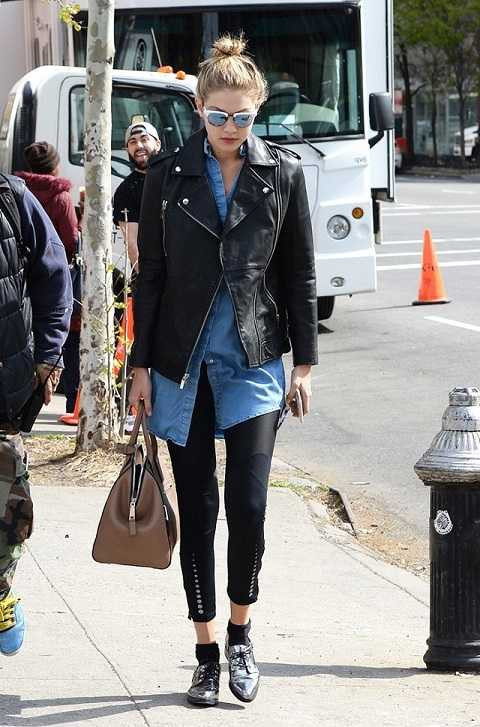 Gigi Hadid luôn xuất hiện với những set đồ phong cách khỏe khoắn. Cô phối khoác da với áo denim, quần leggings, giày oxford, túi da Incognito của Marc Jacobs và mắt kính Vanguarda 11 của Westward Leaning.