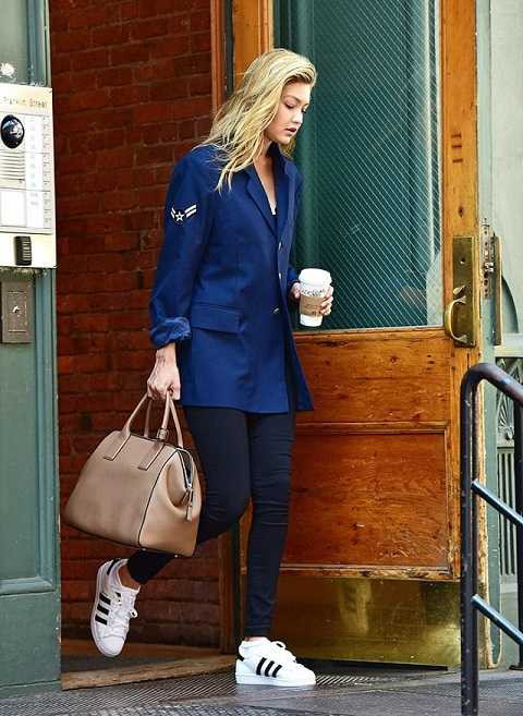 | Túi xách da màu trung tính của Marc Jacobs được cô nàng tận dụng phối với khá nhiều trang phục. Với bộ đồ phong cách hải quân: áo blazer và quần skinny, Gigi Hadid kết hợp cùng giày sneakers của Adidas. |