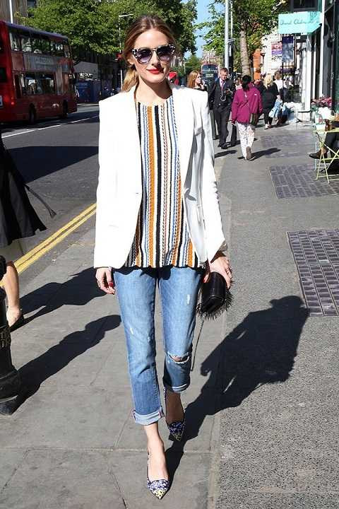 | Olivia Pelermo là một trong những ngôi sao mặc quần jeans đẹp nhất nên thật dễ hiểu khi cô nàng thường mặc jeans. Olivia Pelermo phối quần với áo sọc nhiều màu của Zara với áo blazer trắng cùng giày pump và Clutch Ava của Jimmy Choo. |