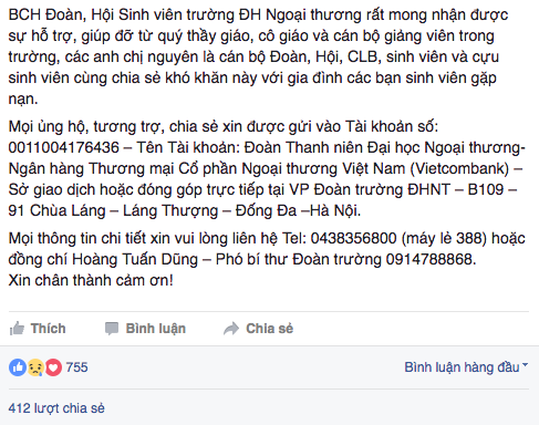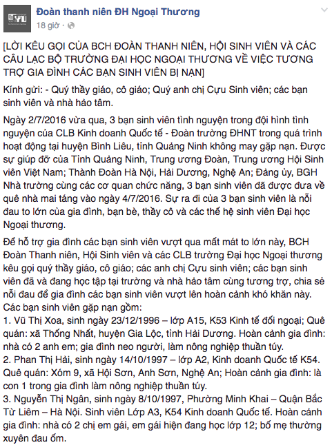 Đoàn thanh niên Đại học Ngoại thương phát động quyên góp để ủng hộ cho gia đình 3 nữ sinh bị nạn