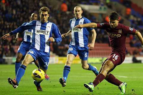 Ra sân với đầy đủ anh tài như Aguero, Silva, Yaya Toure, nhưng Man City lại chơi khá bế tắc trong suốt 45 phút đầu tiên khi đọ sức với Wigan. Trong cả hiệp đấu đầu tiên, các học trò của Roberto Mancini chỉ có đúng 1 lần tung ra được pha dứt điểm nguy hiểm. Nó xuất phát từ nỗ lực cá nhân của El Kun, nhưng từ một góc quá hẹp, tiền đạo người Argentina đã không thể làm nên chuyện.