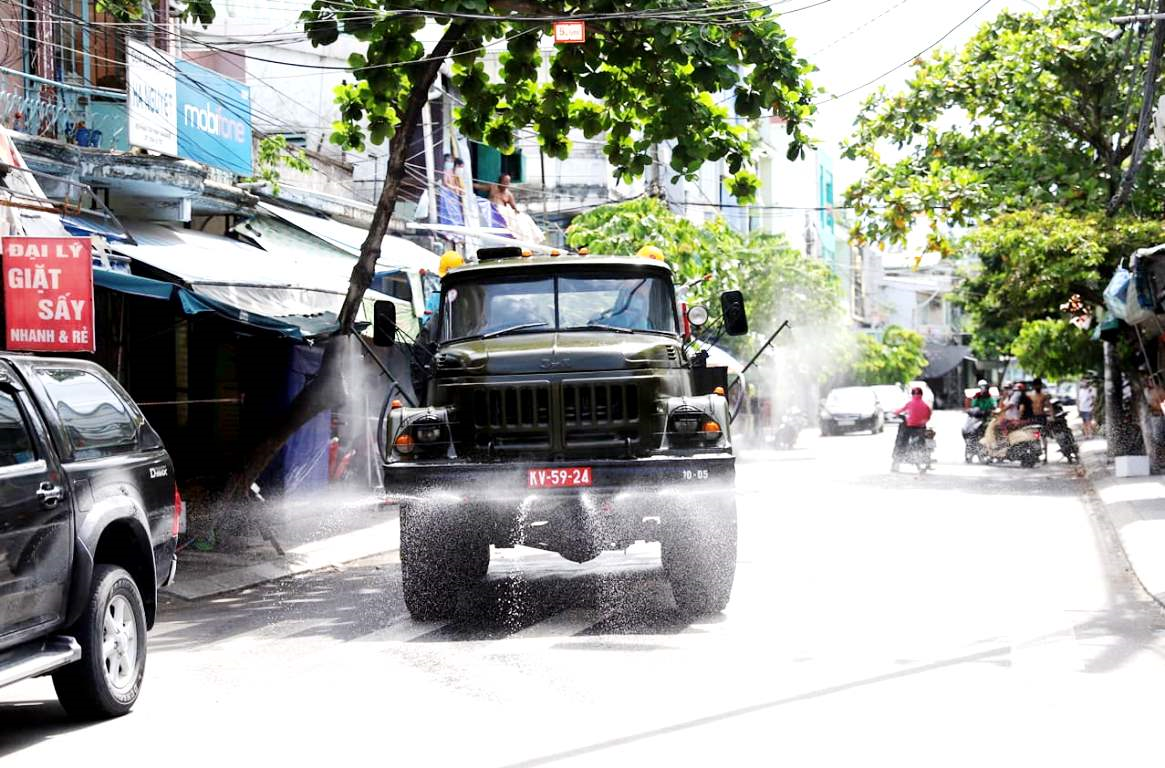 Lực lượng Quân khu 5 phun hóa chất khử khuẩn tại quận Thanh Khê, Đà Nẵng.