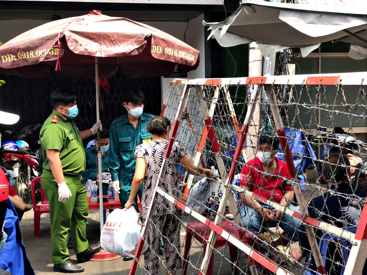 Lực lượng chức năng phong tỏa lối ra hẻm 245 đường Nguyễn Trãi (Quận 1). (Ảnh: Khuất Nguyên)