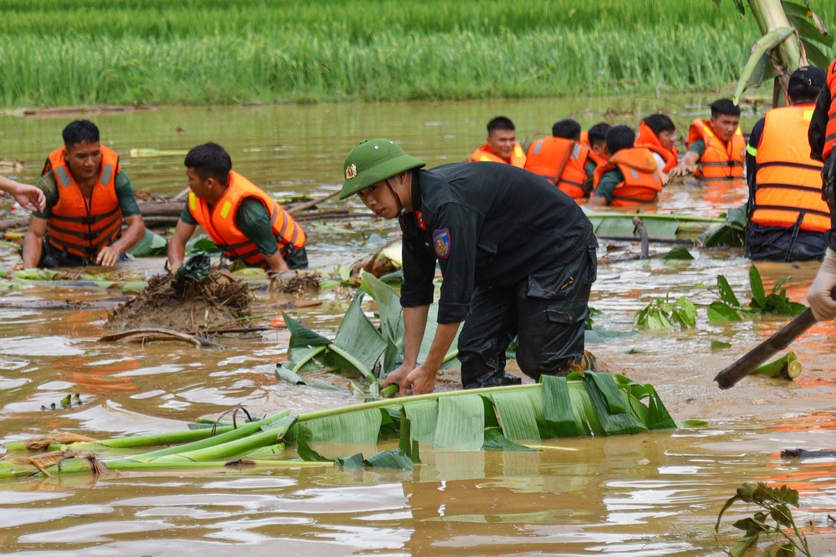 Chiến sĩ công an, bộ đội và các lực lượng dầm mình dưới nước lũ tìm kiếm những nạn nhân bị mất tích trong vụ lũ quét ở Làng Nủ (xã Phúc Khánh, huyện Bảo Yên, Lào Cai).