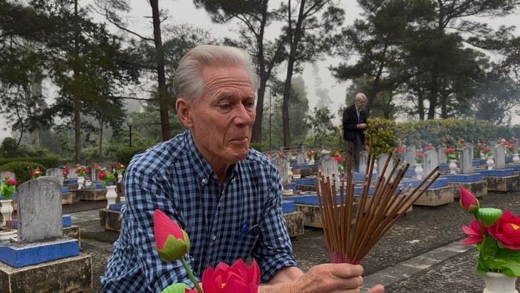 Nhân vật Craig McNamara dâng hương tại Nghĩa trang liệt sĩ quốc gia Trường Sơn trong VTV đặc biệt "Cuộc đọ sức của ý chí". (Ảnh: VTV)