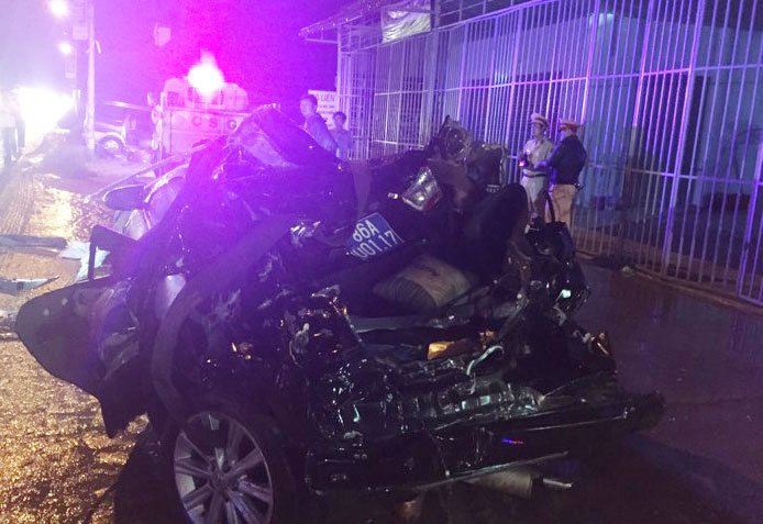 Vụ tai nạn khiến xe ô tô của công an tỉnh Bình Thuận bị hư hại, biến dạng hoàn toàn.