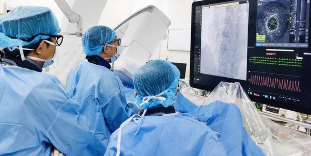 Ekip bác sĩ Bệnh viện Đa khoa Tâm Anh đặt stent tái thông mạch máu tim cho bệnh nhân.