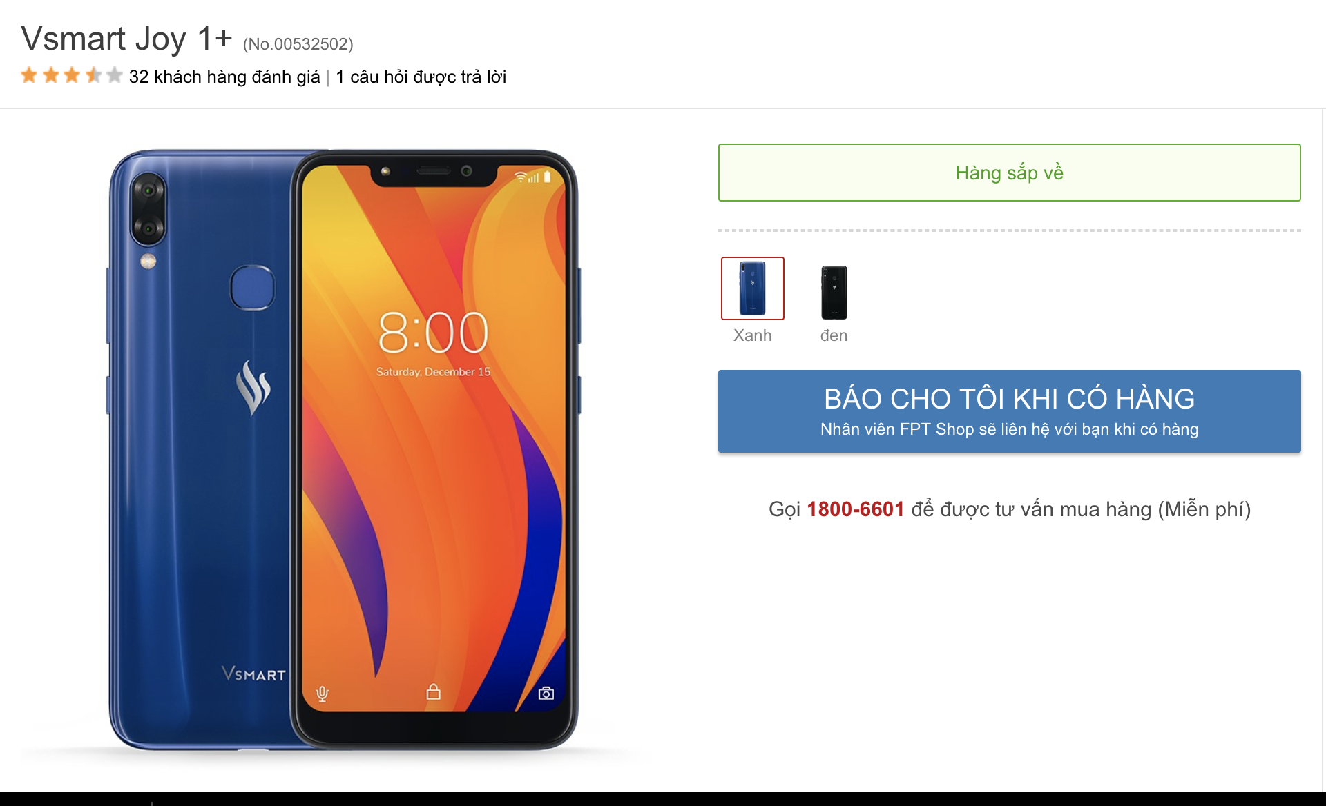 Thông tin trên FPT cho biết, mẫu Joy1 có cấu hình thấp nhất, đây cũng là mẫu máy rẻ nhất của Vsmart.