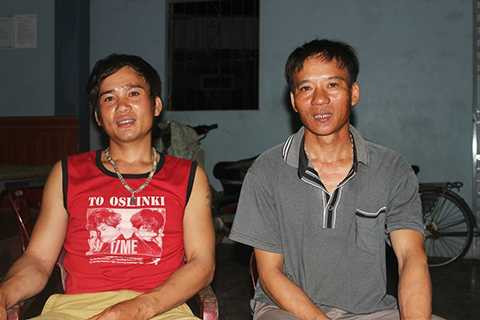 | Hai ngư dân đầu tiên Trần Ngọc Quân (ảnh phải) và Trần Ngọc Thắng phát hiện và huy động lực lượng, phương tiện trục vớt vật thể lên bờ. (Ảnh: Văn Đức) |
