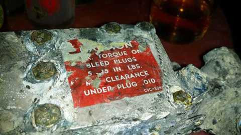 | Dòng chữ và ký hiệu in trên 1 bộ phận đã bị tách rời ra khỏi khối kim loại nghi là đuôi máy bay. (Ảnh: Duy Tuấn) |