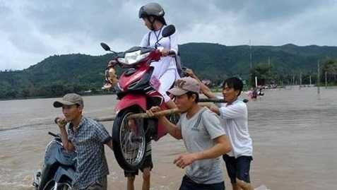 Trên đường đi học về, nhiều nữ sinh mặc áo dài không qua được nên nhóm 4 thanh niên dùng thanh gỗ xuyên qua bánh xe máy để khiêng cả người và xe vượt lũ. Trong ảnh là nữ sinh học lớp 11A6 trường THPT Lê Lợi.
