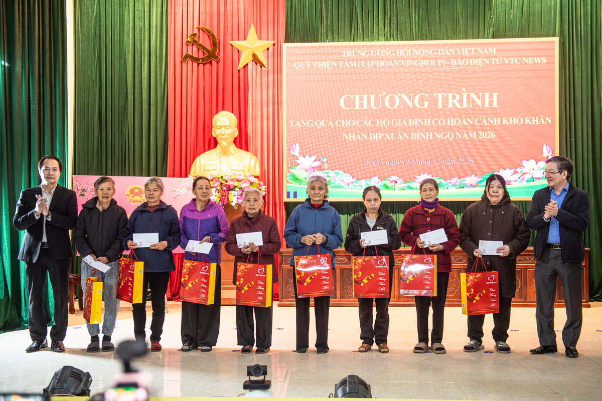 Sáng 8/2, Trung ương Hội Nông dân Việt Nam, Quỹ Thiện tâm (Tập đoàn Vingroup) và Báo Điện tử VTC News trao 400 phần quà Tết tới 400 hộ dân có hoàn cảnh khó khăn ở xã A Sào, Hưng Yên, với tổng trị giá 240 triệu đồng.