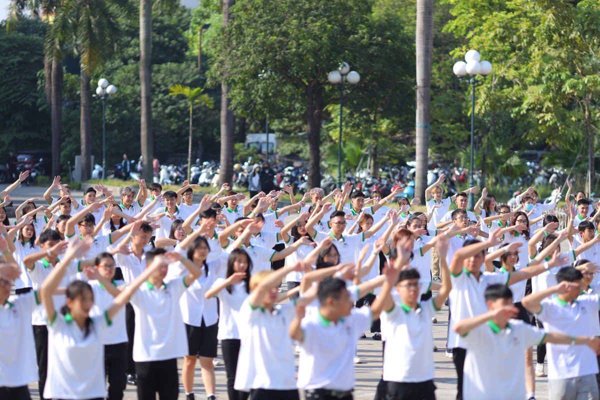 Đại diện nhà trường cho biết, để thực hiện tiết mục đồng diễn này, 400 thầy cô, sinh viên đã tập liên tục trong 3 ngày.