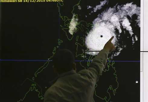 | Người dự báo thời tiết chỉ trên bản đồ đường đi của cơn bão Melor |