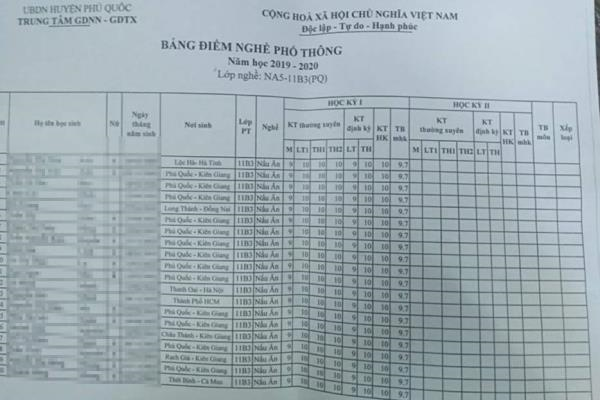 Bảng điểm nghề nấu ăn của một lớp tại trường THPT Phú Quốc khiến nhiều người ngỡ ngàng. Bảng điểm có 7 cột từ kiểm tra miệng, kiểm tra thực hành, kiểm tra lý thuyết (cả thường xuyên và định kỳ), kiểm tra học kỳ của 42 em đều giống nhau.