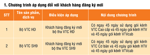 Cụ thể, Khách hàng đăng ký mới bộ thu VTC HD có ngày 45 ngày sử dụng gói kênh VTC Cao cấp và 45 ngày gói kênh HTV và 45 ngày gói kênh VTV Cab. Tương tự khách hàng đăng ký mới bộ thu VTC SH9 cũng có ngay 45 ngày sử dụng gói kênh VTC Cơ bản và 45 ngày gói kênh HTV và 45 ngày gói kênh VTV Cab.