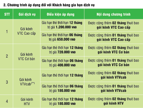 Ngoài ra, VTC cũng có chương trình ưu đãi lớn dành cho những khách hàng gia hạn. Cụ thể, khi Khách hàng đang sử dụng dịch vụ truyền hình VTC gia hạn các Gói kênh VTC Cao cấp, Cơ bản, VTV Cab, HTV thời hạn 12 tháng được cộng ngay thêm 02 tháng thuê bao gói kênh tương ứng. Gia hạn các gói kênh thời hạn 06 tháng sẽ được cộng thêm 01 tháng gói kênh VTC hoặc VTVcab tương ứng.