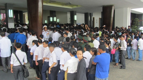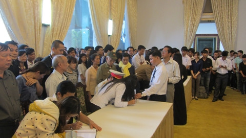 Phòng ghi sổ tang luôn đầy ắp người đứng chờ để được bày tỏ những nỗi niềm, cảm xúc của mình sau khi được vào khuôn viên Hội trường Thống Nhất viếng Đại tướng Võ Nguyên Giáp.