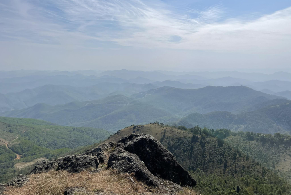 Lên đến đỉnh vào gần trưa, du khách có thể ngắm vùng đất Kim Bôi với những dãy núi xen kẽ nhau, xếp chồng lớp, tạo thành một khung cảnh đẹp. Sau khi chụp ảnh check in và nghỉ ngơi, du khách sẽ đi xuống và dùng bữa tại một khu đất trống cách đỉnh khoảng 15 phút di chuyển. Tùy nhu cầu, du khách có thể tự mang theo đồ ăn uống, đặt dịch vụ của người địa phương dưới chân núi hoặc các tour trọn gói.