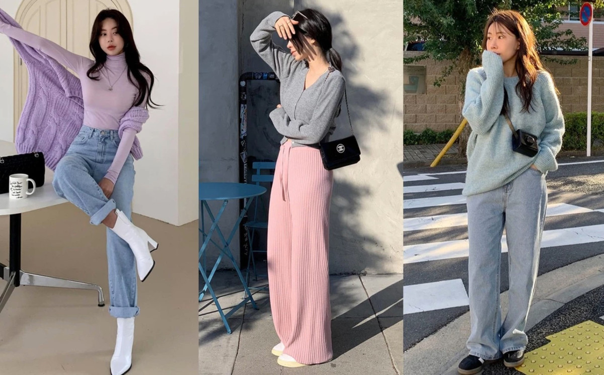 Sự kết hợp giữa quần len màu hồng pastel với áo len ghi xám sẽ tạo nên set trang phục hài hòa.