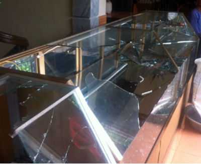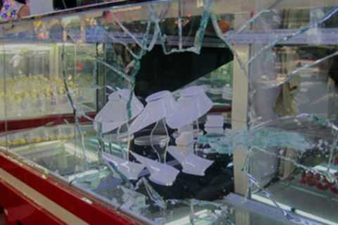 Khi bị nhóm cướp tấn công, hai vợ chồng chủ tiệm vàng hốt hoảng kêu cứu rồi bỏ chạy theo lối cửa sau.