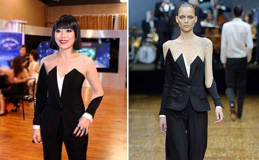 Mới đây nhất, xuất hiện tại Gala 3 Vietnam Idol 2014, Mỹ Tâm diện bộ vest cắt khoét lạ mắt với kiểu dáng có rất nhiều điểm tương đồng với thiết kế ready-to-wear thuộc bộ sưu tập Xuân hè 2007 của thương hiệu Hà Lan Viktor & Rolf.