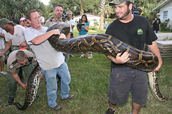 Thậm chí có tài liệu từng ghi nhận phát hiện có cá thể nặng tới 181 kg và chiều dài 8,2m được tìm thấy ở Công viên Serpent Safari, bang Illinois nước Mỹ. Tuy nhiên sau khi con mãng xà trên qua đời, kỷ lục thế giới loài rắn khổng lồ vẫn ghi nhận chiều dài 18m là cực đại. Loài mãng xà Miến Điện từng sinh sống ở Florida Everglades, tuy nhiên ngày nay chúng gần như biến mất vì bị săn bắt lấy thịt. Ảnh: Con mãng xà Miến Điện dài 5,5m ở Florida Everglades.