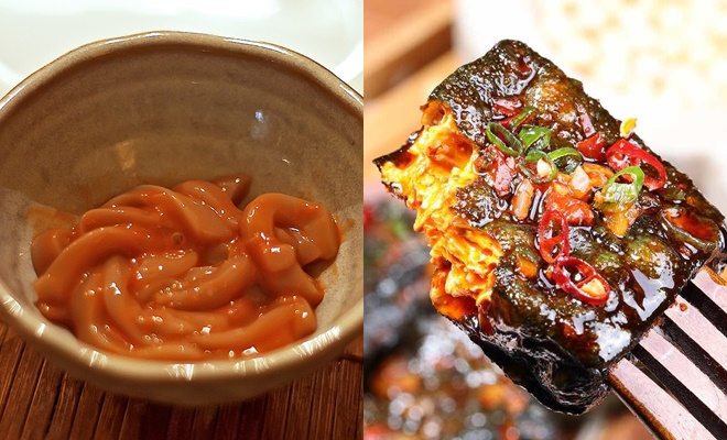 Một món lên men khác cũng rất thử thách của Nhật là Shiokara. Món ăn làm từ nội tạng cá sống hoặc mực nang, trộn với muối và mạch nha trước khi cho lên men trong hũ thủy tinh kín. Sau thời gian ủ khoảng 6 tháng, những miếng hải sản có độ sền sệt, hơi nhớt cùng mùi vị tanh nồng đặc trưng thêm mùi chua của lên men tạo thành tổng thể không dễ chịu chút nào.