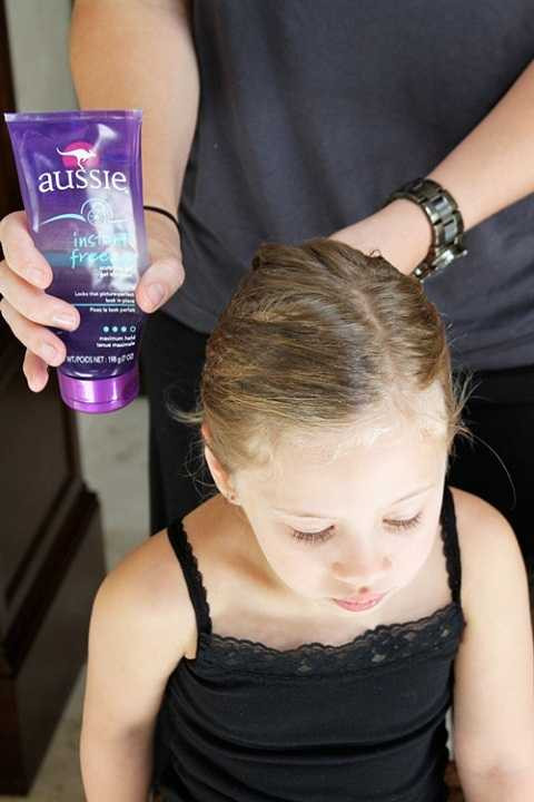 | Dùng một lượng gel nhỏ bôi lên tóc bé. Mẹ không cần thiết phải dùng gel nhưng gel sẽ khiến tóc dễ cầm nắm, chia tách, làm thành nơ tóc đẹp và gọn gàng hơn. Mẹ dùng một tay cào rồi giữ lọn tóc, một tay thêm gel vào tóc, cứ thế bôi gel cho bé. |