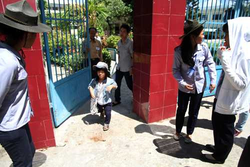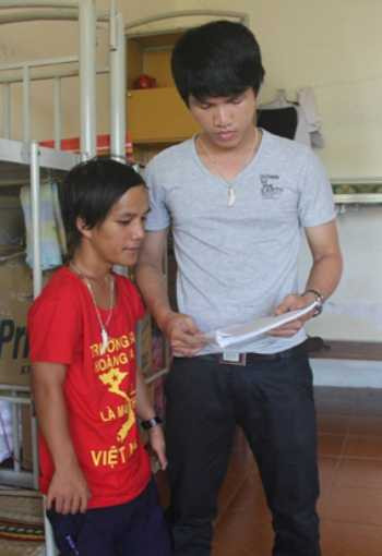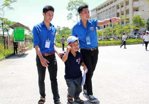 | Vượng được các tình nguyện viên hướng dẫn tại trường thi. |