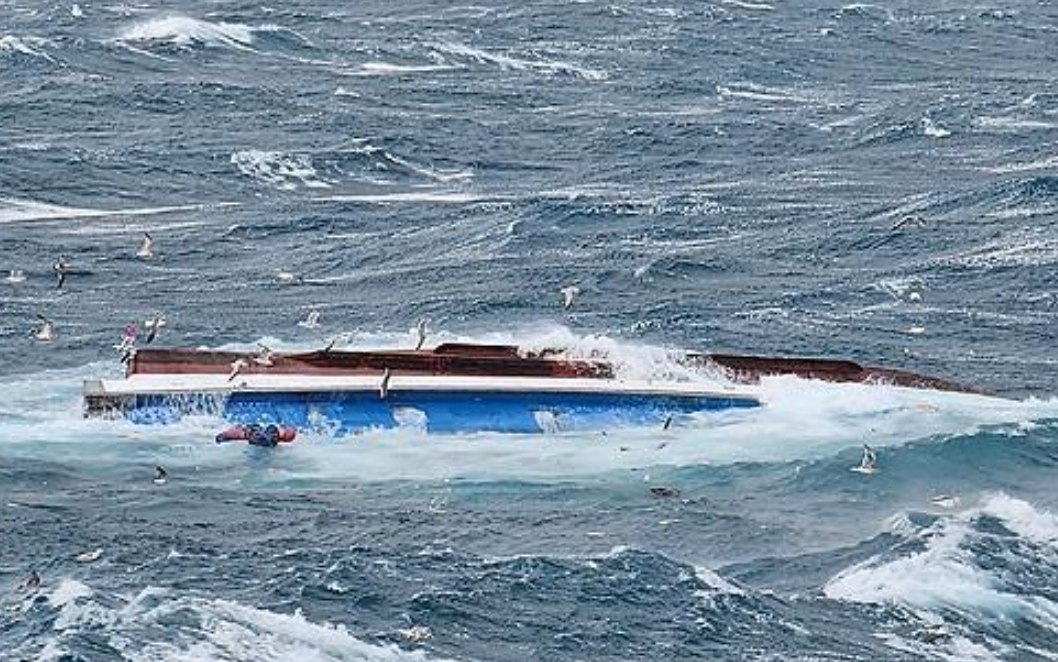 Hình ảnh do cảnh sát biển Hàn Quốc cung cấp cho thấy một tàu đánh cá bị lật ở vùng biển ngoài khơi đảo Jeju vào ngày 1/3/2024. (Ảnh: Yonhap)