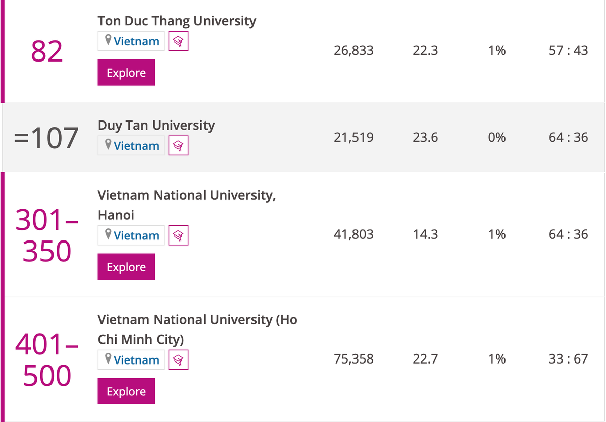 Đó là 5 trường: Đại học Tôn Đức Thắng vị trí 82, Đại học Duy Tân 107, Đại học Quốc gia Hà Nội 301 - 350, Đại học Quốc gia TP.HCM 401 - 500 và Đại học Bách Khoa Hà Nội xếp hạng 501+. So với năm 2021, Đại học Quốc gia Hà Nội và Đại học Bách khoa Hà Nội tụt hạng. Còn Đại học Quốc gia TP.HCM vẫn giữ nguyên xếp hạng ở vị trí 401 - 500.