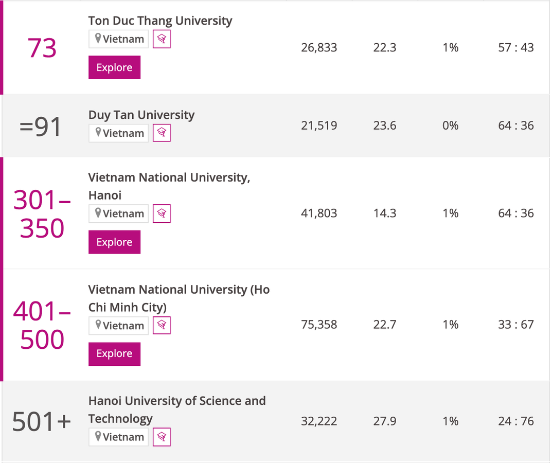Trong tổng số 5 cơ sở giáo dục đại học của Việt Nam được xếp hạng, Đại học Quốc gia Hà Nội được đánh giá cao nhất ở nhóm tiêu chí Giảng dạy; tiêu chí Trích dẫn là thế mạnh của Đại học Tôn Đức Thắng và Đại học Duy Tân; Đại học Quốc gia TP.HCM vẫn duy trì thế mạnh về thu nhập chuyển giao tri thức và công nghệ qua các năm xếp hạng.