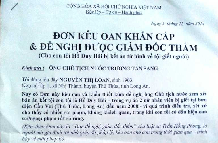 Theo chị Loan, chị viết đơn này kêu oan và khẩn thiết đề nghị Chủ tịch nước xem xét bản án kết tội con chị là Hồ Duy Hải trong vụ án 2 nữ nhân viên bị giết tại bưu điện Cầu Voi (Thủ Thừa, Long An) đầu năm 2008. Vì quá trình điều tra, xét xử cho thấy có nhiều sai phạm, không khách quan, trong khi con chị có dấu hiệu oan sai, ngoại phạm rất rõ ràng.